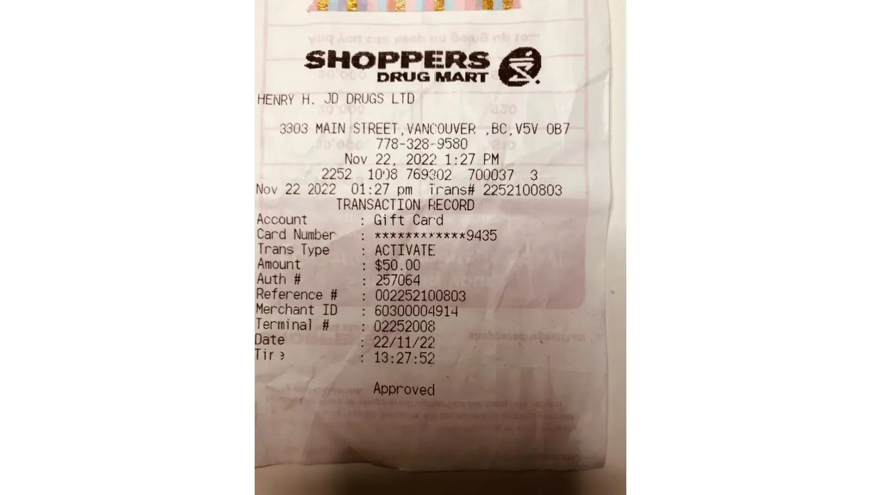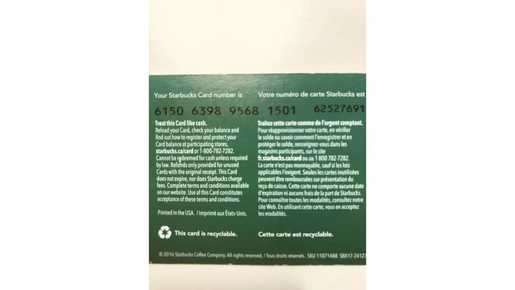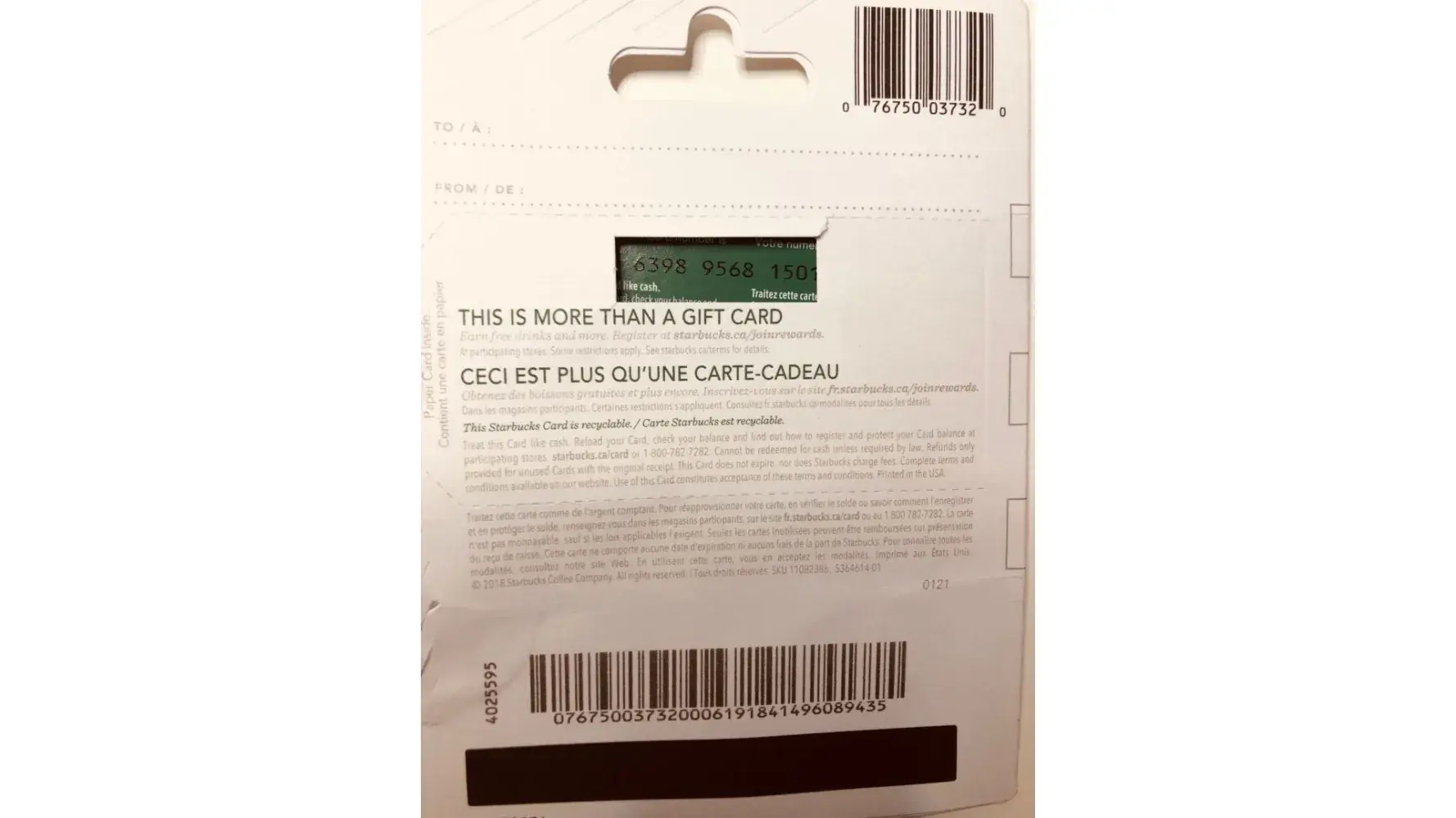 My daughter sent me Starbucks Gift card to me for X'mas gift, But no Value inside, She bought from Shoppers Drug Mart (3303 Main St Vancouver), Pls see attached photo P1, P2, P3, P4, Whould You kindly Look into It, And Let me know If I can get a New gift card or Refund Best Regards