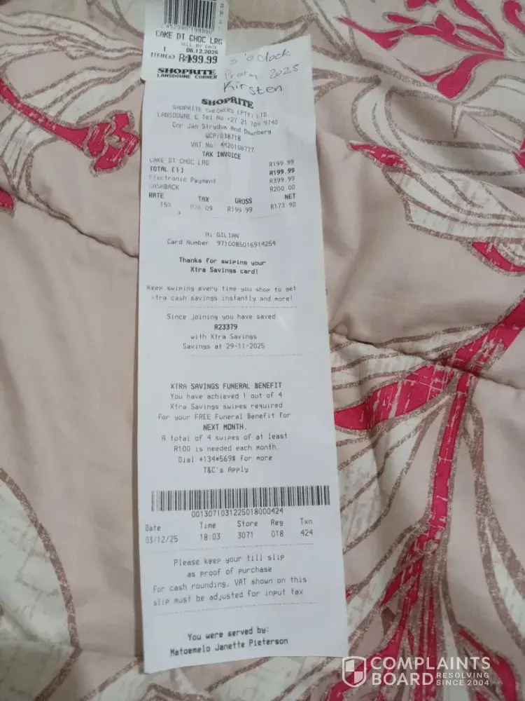 The spelling on the cake was incorrect. Prorm and it had to say Prom. It was a chocolate cake prize R199. 99. WCP/038718 VAT No: [protected]. Date I ordered was 3/12/25 at 18:03. Store 3071 Reg 018 TX 424. I collect the cake on Thursday. I sincerely hope that my complain would be resolved. I personally would not buy any cakes for a function at Shoprite Lansdowne corner in the future