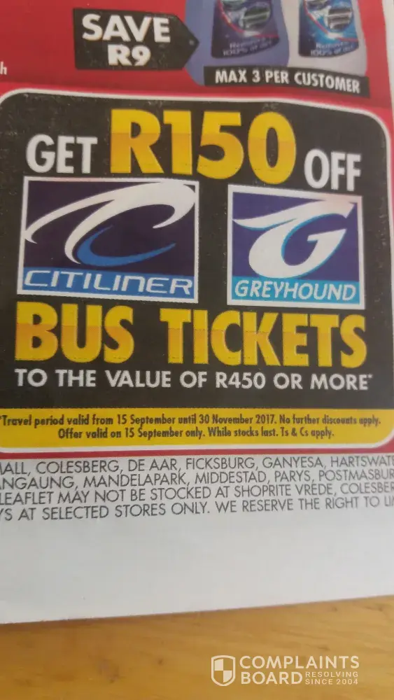 On 15/9/17 went to shoprite Hartswater to purchase a ticked as advertised, to my suprise was told to pay the usual amount.Though I explained to the cashier nothing helped. I immediately called customer care to seek clarity.I was told I qualify and the lady asked to speak to the cashier upon the end of their conversation again the cashier told me i had to pay that amount cos ticket already discounted which was not true. I didnt write the call ref no. as she hang up before she could speak to me again.but I have her name and time I called. Was there a misunderstanding?