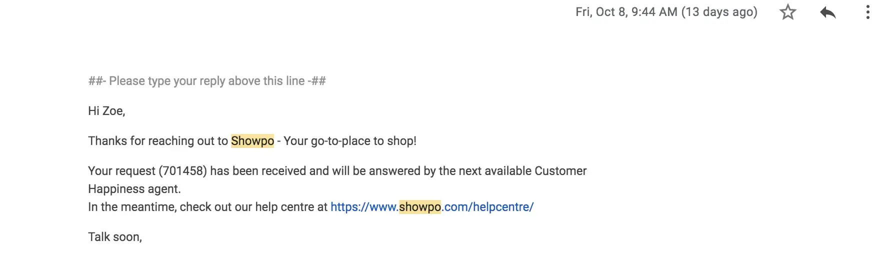I contacted Showpo and asked for a refund but they refused and only said that they were very sorry. They never offered me any help and every time I contacted them they kept replying with the same automated message that they were sorry.