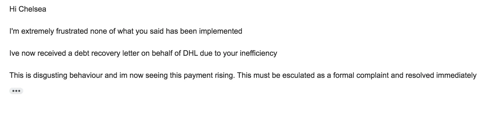 Desired outcome: For showpo to pay the fee to DHL that is owed so that my name is not on a debt