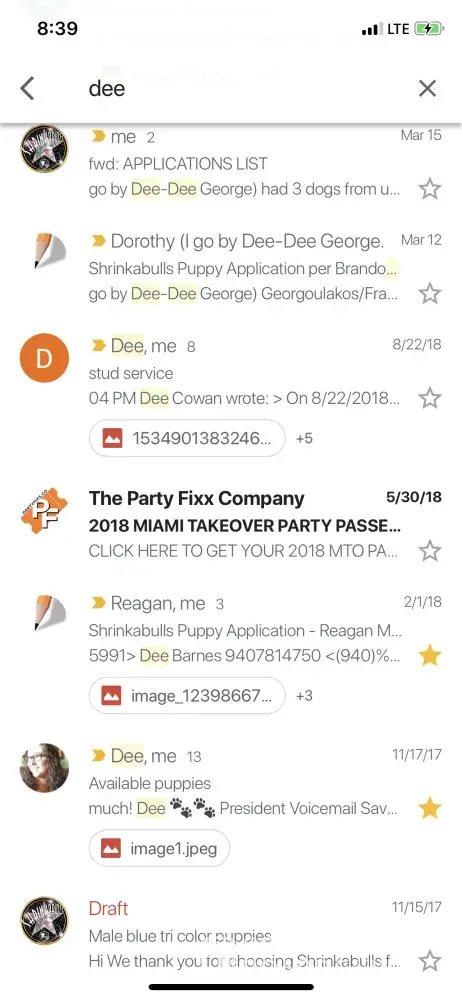 I m attaching photos of my email search. The only Dee is Dee Dee G. Who has had 3 bulldogs from us over 15 yrs & is asking for a 4th. And a Dee someone listed as a reference. I searched for the name Stitch also pictured & the only search results were referring to medical stitches. No dogs named Stich.