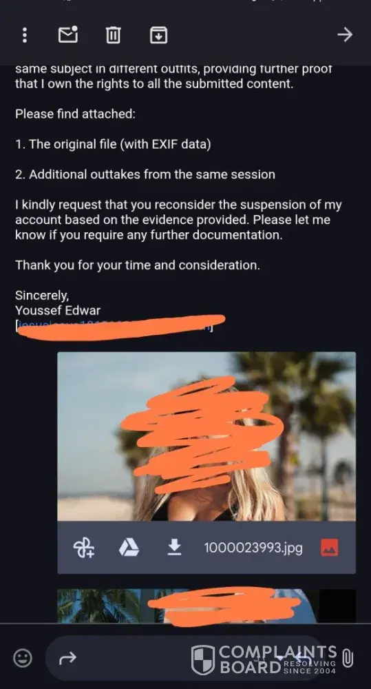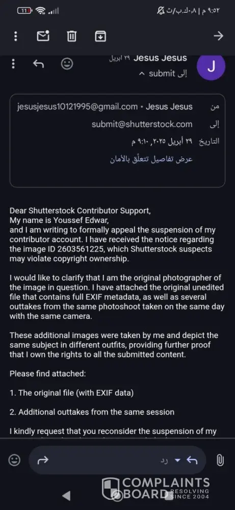 I was a Shutterstock contributor for over a year with a clean record. On April 29, 2025, my account was suspended for alleged copyright infringement. I immediately submitted multiple outtakes from the same photoshoot, full EXIF data, and a clear explanation showing I own the content. They never replied. Two months passed. I followed up multiple time...