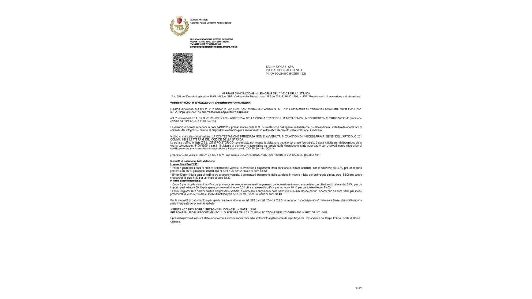Received 2 traffic violations where Sicily By car is the offender and transmitting personal information without my consent. Plus charge 50Euros+taxes administration fee without resolving the issue. I need someone to contact me immediately since this is unacceptable customer service and without consent.