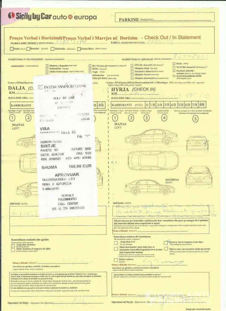 Buonasera! Il 30/6 u.s. restituivo a Saranda (Albania) una vs. autovettura che avevo noleggiato a Tirana il 26/6 per il tramite di Rentalcars (v.all.). Con mia estrema sorpresa mi veniva addebitato l'importo di EUR 168.00 per un minuscolo graffio, quasi invisibile (vedi foto all.), che non sono nemmeno sicuro di aver procurato, trattandosi appunto di un segnino difficilmente rilevabile al momento del ritiro della vettura. Pagavo comunque (v.all.) e nel contempo sottoponevo la mia contestazione (v.all.), alla quale non ho finora ricevuto nessun riscontro.