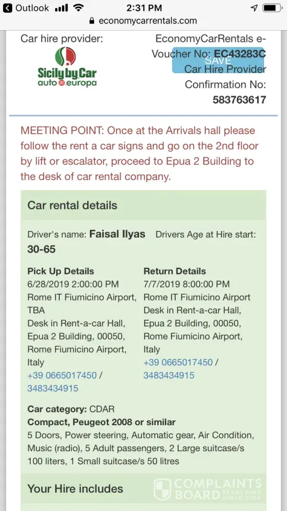 This is to report an issue concerning the car rental from Sicily by car during our stay in Rome.