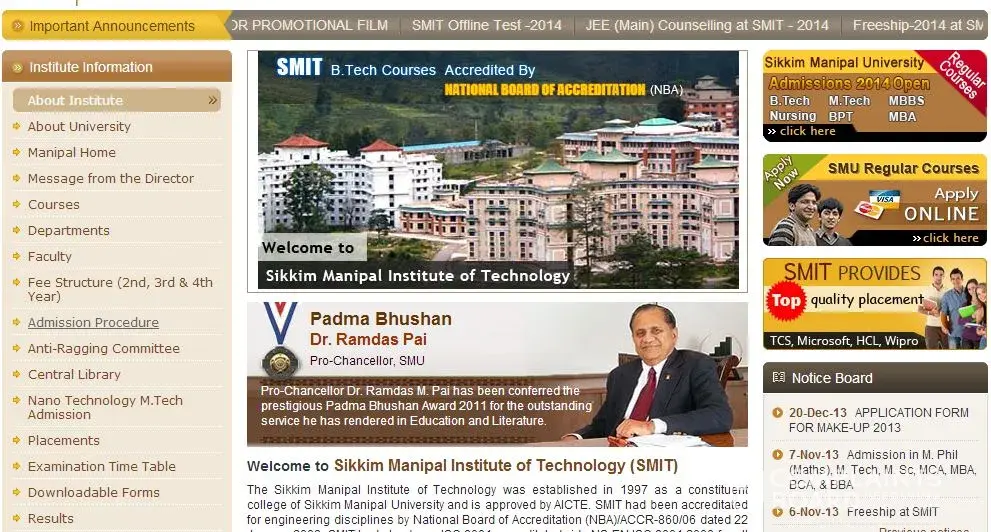i would like to draw attention towards high amount of forgery and malfunctioning being done by college authorities in sikkim manipal institute of technology. First of all i would like to suggest all students never ever take admission in SMIT. The administration is very poor and they hardly take care of students problems. The fee is very high about 2.5 lacs per annum but services provided in return is worst than some cheap government colleges. This college advertises that it provides 100% placement record which is BIG LIE. 29% of 2014 batch is placed and placement season is over.To hide its failure its blaming the students that they're not capable of getting jobs. For that reason they started failing students deliberately to reduce number of eligible students for placements. they failed about 60% students in 7th semester. They do so to charge extra semester fee along with hostel and mess charge. This college is like a leach which is playing with lives of students. They taunt students not to raise voices saying it will have bad effects on their grades and many students are afraid to lodge complaints because they're threatened to be detained.