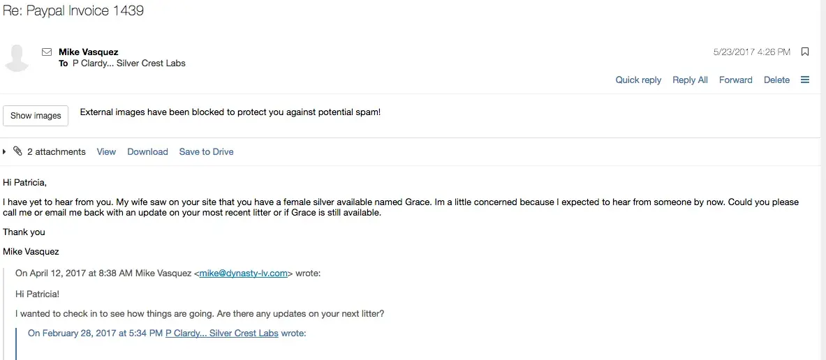 I first inquired about my purchase on 2/26/17 which Patricia was very nice and informative. I then made my $250 security deposit on 3/01/2017. We discussed litters arriving around May/June. Everything was great and looking positive.