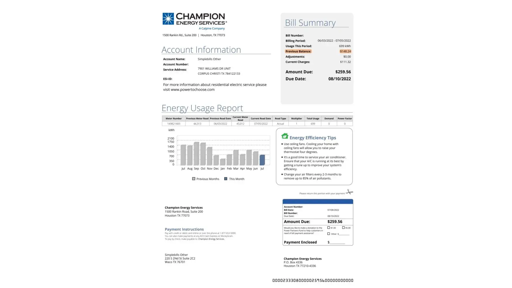 My bank statement shows I paid every month that my two sons had lived in the apartment - there was never a 3 month time period that money was not taken out by Simplebills. They have lived there for 10 months and for 10 months I have had money withdrawn from my bank account. Some months they decided to take money out twice like in January and March. Some months like December, May, and June they decided to take money out in the middle of the month. I have been paying utility providers for over 30 years and have never been billed twice in one month and never had money taken out in the middle of a month (unless I had scheduled it to do so). I am typically billed for a 30-day period and will pay for those 30 days in the next month. Then we come to the last month of billing. They said it was for 3 months but my bank statement never missed a month of them removing money from my account and they didn't start taking money out of my account 3 months after my sons moved in. The lease started in September and they took their first payment out of my checking account on September 28th. When I looked at the last Champion Energy statement it shows that they did not pay the previous month's bill yet I had money taken out of my bank account for them to pay it. I have asked them to explain to me why they withdrew money every single month yet did not pay the electric company. They paid for water and sewer every month but decided not to pay for electricity...even though I showed them on my bank statement that they took money from me to pay for all 10 months. When they did not pay Champions they then rolled the previous nonpayment over to the next bill and added it to the amount owed. I have asked Simplebills to let me know how they plan on correcting this error. They always come back with the same response - You paid in arrears. The first time I talked to someone from Simplebills they were outside playing with a dog. I asked her if she was outside with her dog and she said, "no". I then heard a door open and the wind stopped blowing and the dog stopped barking. She wasn't even at a desk or looking at my account on a laptop. She was outside enjoying a nice day playing with her dog while she kept giving me different reasons why they overbilled me. It was like she was reading a script. I have attached the last Champion Energy statements (I pay for 2 sons so I have 2 statements each month). You can see they added $148.24 to my current bill for each son. That means I overpaid last month by $296.48.