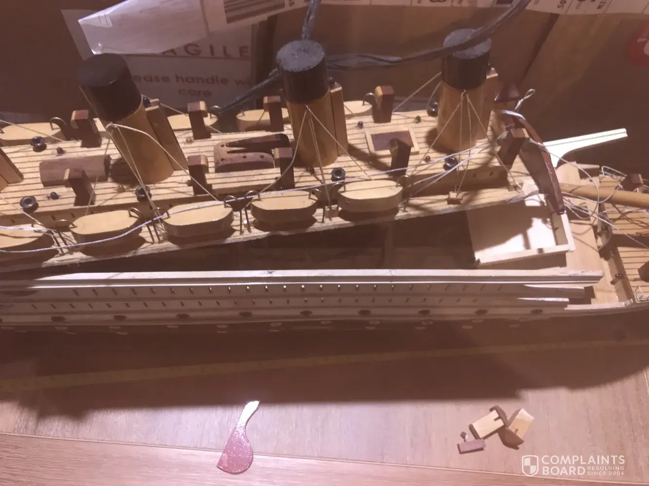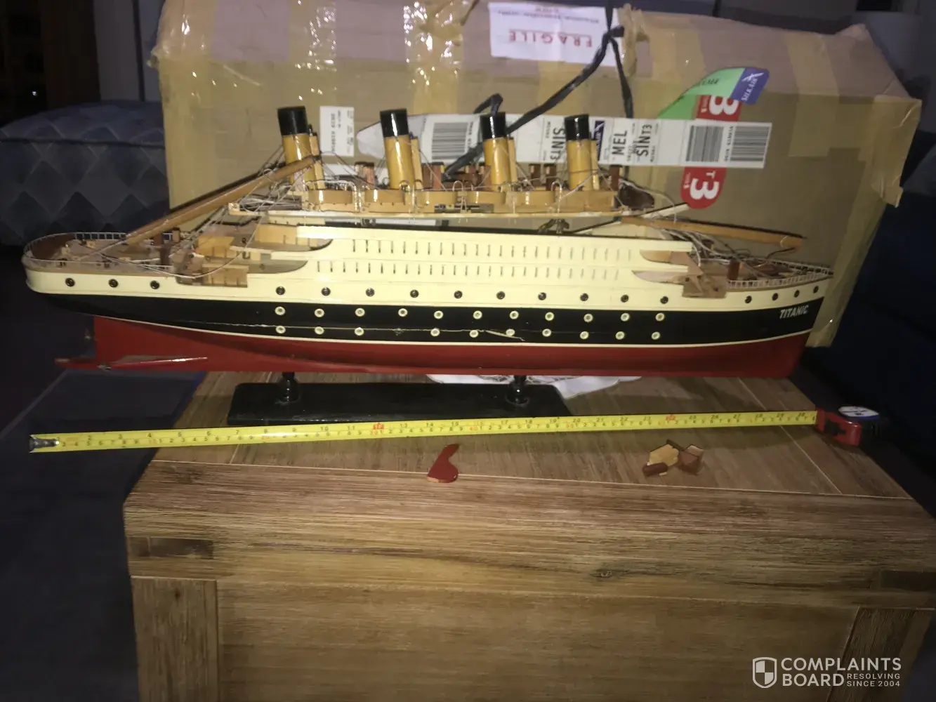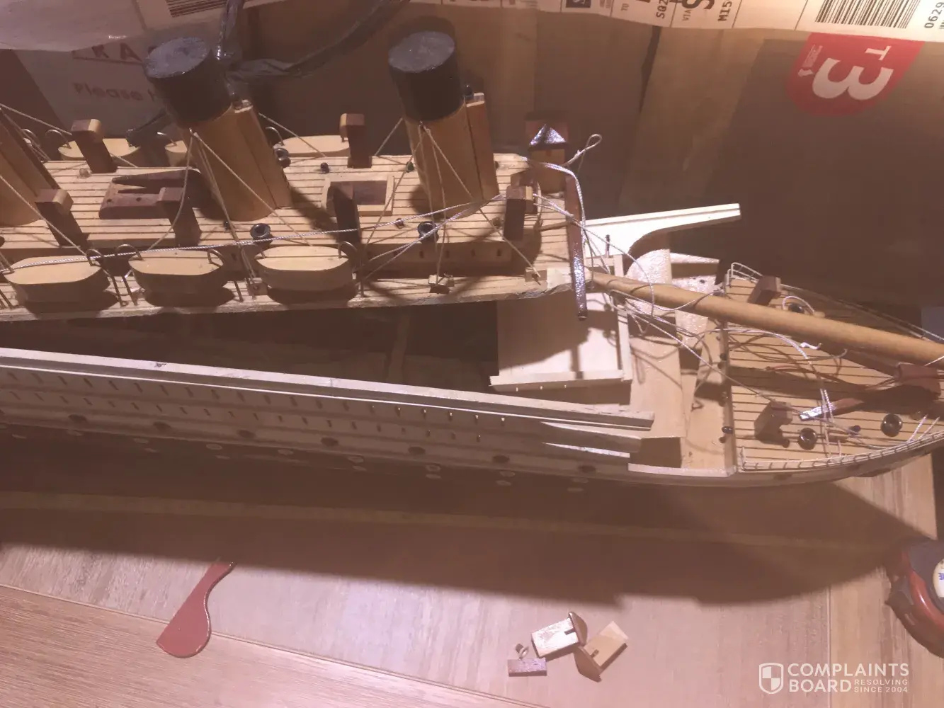 Hey, this is Roilo Den, im complaining about my baggage/Souvenir item (Titanic Replica/Wooden Model) which in the box with fragile all over the box. It cost around 399$, (ebay price as I dont have the receipt) it is handcrafted, and been with me few years ago. It has sentimental value for me as I was a Seaman. The box was checked in due to its size as per the lady in the counter during checked in. It measures about 80cmLx12cmWx30cmH. Please see attached photos.