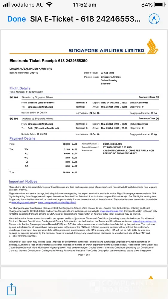 Problem rectified very quickly! Result was an error made by travel agent! Singapore Airlines reacted very considerately and professionally with acceptable settlement. Most impressed!
