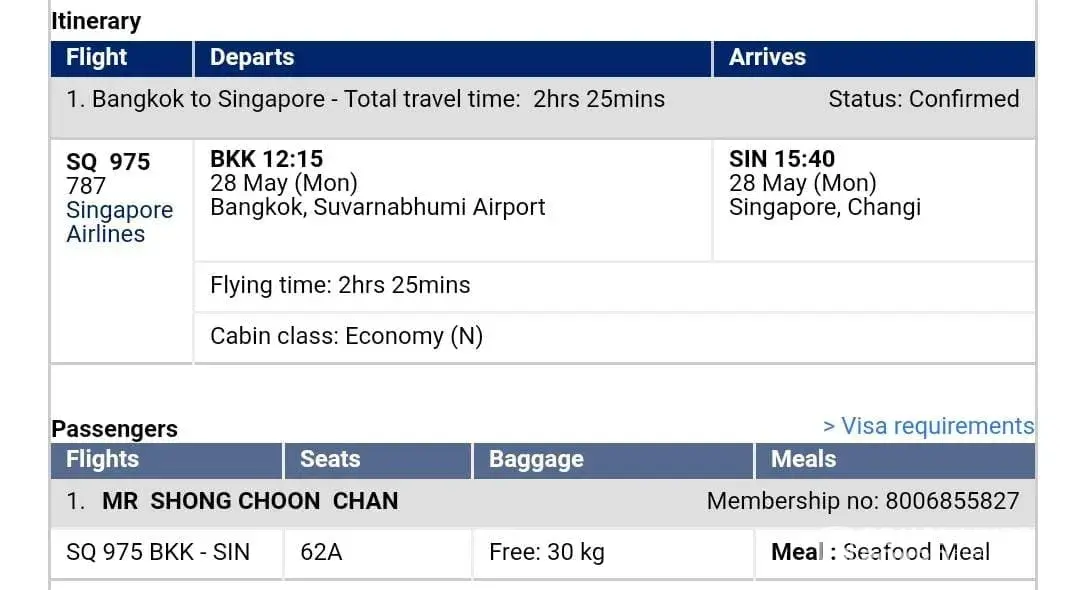My brother Mr Chan Shong Choon, a Singaporean, was travelling on SQ975 from Bkk to Sin on 28th May 2018. His seat was 62A.