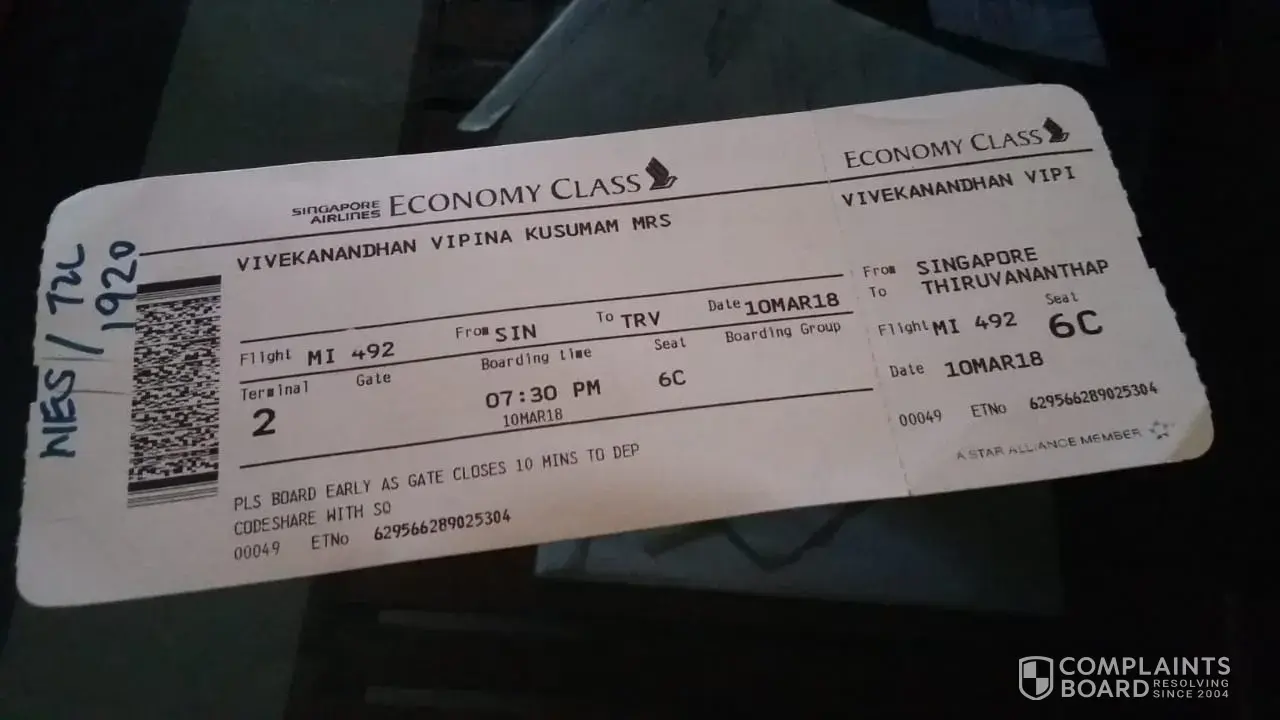 We were travelling with the flight sq-298 from christchurch to changi, singapore and then we would have boarded the flight sq-452 from singapore to male international. Our reference code was: eraztr and we had booked our ticket through mytrip.com.