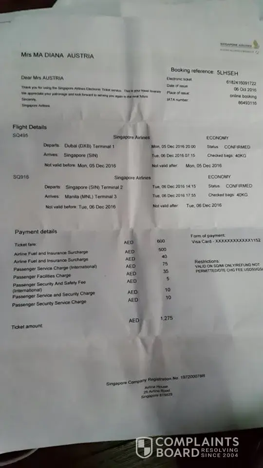 I was a passenger of SQ495 ( December 5) Dubai to Singapore with connecting flight SQ 916 ( December 6) Singapore to Manila. This is my first time to travel using Singapore Airline because it is out of my budget. I was just advised by my friends to travel with this airline because of the big baggage allowance compared to other airlines. Unfortunately, when I received my TV LG / LED 43 inches IN NAIA ( PHILIPPINES) it is TOTALLY DAMAGED. I feel so sad and cant understand why this thing happened. This is my only gift ( pasalubong) to my family I was advised by the airport staff in NAIA airline ( PHILIPPINES)that they will not able to assist me in the complain. I also noticed that there is no FRAGILE tag in my TV even though I already informed AND IT IS VERY OBVIOUS that it is a TV. I am humbly asking for your assistance to please help me. This is the only thing that I bought for my family and as souvenier OFW for 4 years. I am begging you to please help me if there is a way for us to get my money back or if you can replace my TV even if it is smaller one ( refund ) this for my daughter which we dream and I promised to her 4 years ago. I hope you can consider my request and hope for your kind understanding.