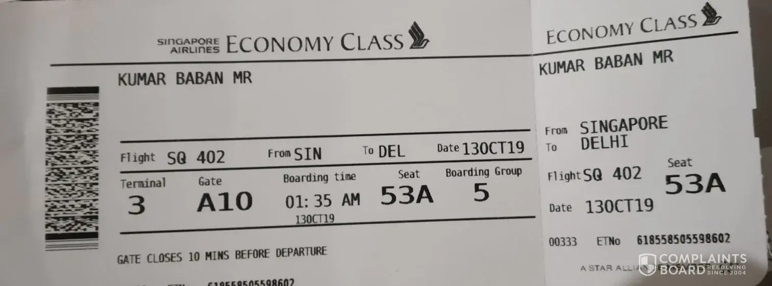 Sub: Compensation for unpleasant Travel from Singapore to Delhi Flight SQ 403 on 13th Oct'19.