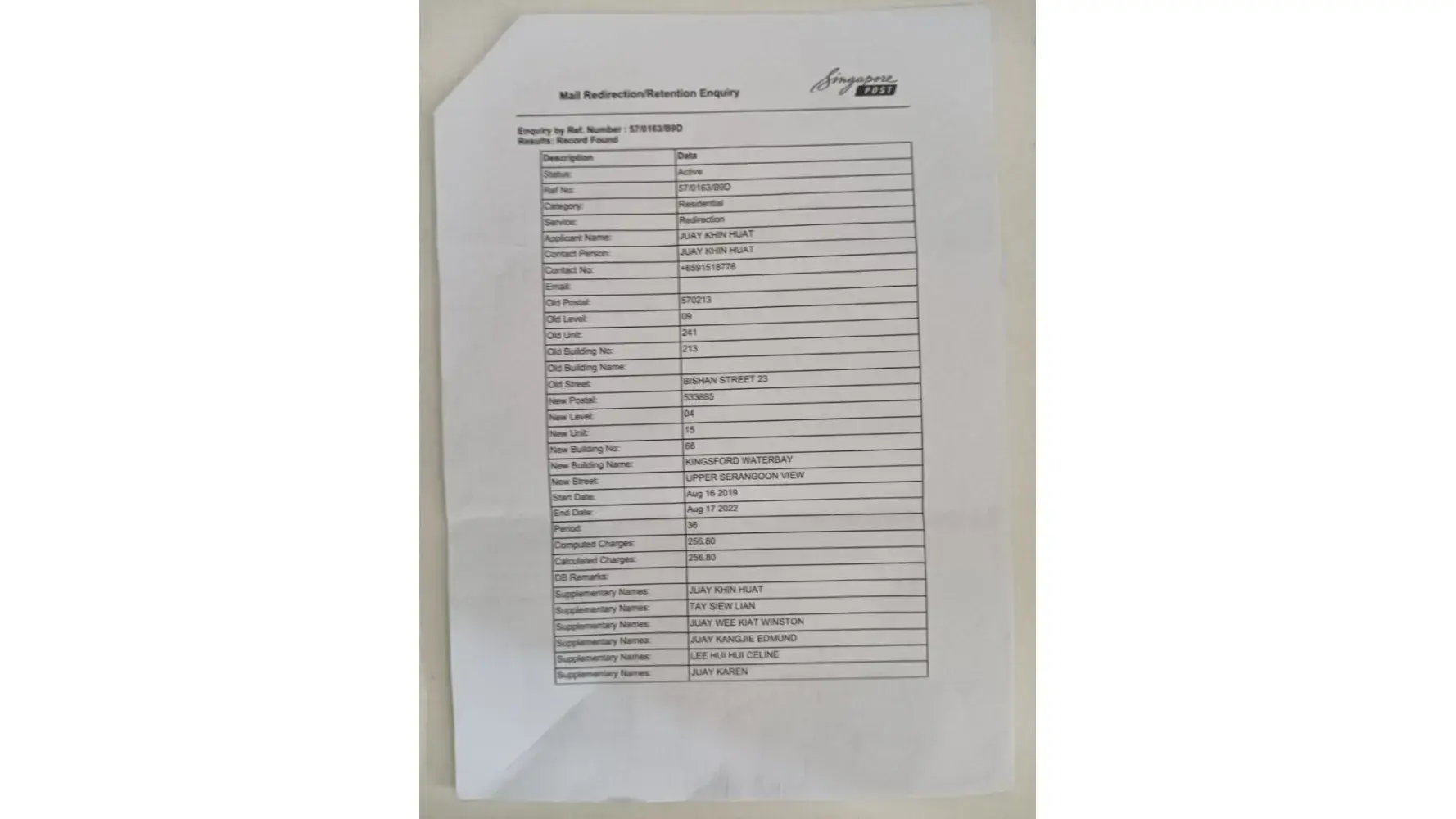 I have applied Mail Redirection Service from Singapore Post & paid $256.80 every six month. In order to forward any mails from my residentail address : Blk 213 #09 - 241Bishan Street 23 to Redirect them to my mailing address at 66, Upper Serangoon View #04 - 15 Singapore 533885 with Supplementary Names as per applied {see attach}.