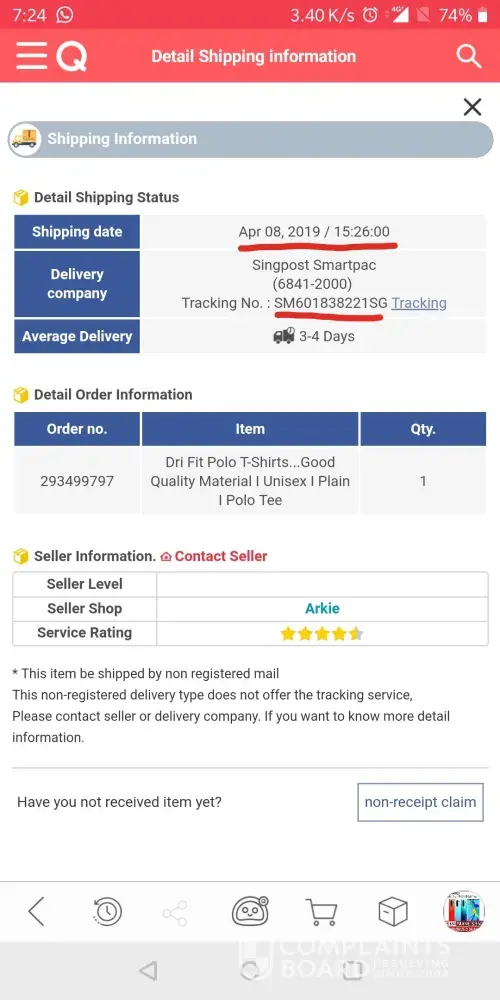 Bought a product from Qoo10 choosing Smartpac delivery service, seller sent out parcel on 8th April and provided tracking number. Was unable to track parcel until 17th April which is also the date I received the parcel. Tracking shows that postman only start to deliver parcel on the 17th which is 7 working days later(Smartpac 3-4 work days). Paid Smartpac service only to receive normal parcel delivery service, I believe this is a case of fraud!