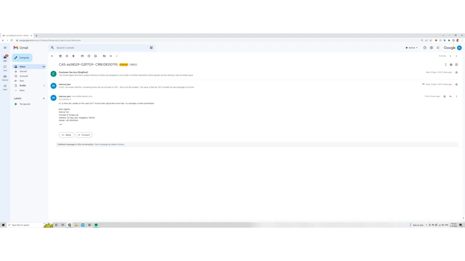 The GST of my packages are incorrect. Despite repeated enquiries on the issue (10+ times) with customer service since 21st September, there has been no update to my case CAS-6658529-G2P7G9- CRM:[protected]. Instead of paying 7% GST for 3000SGD worth of my imported product. The GST payable is 7% of 7000SGD. I have called "1605" 5 times, Singpost Live chat 3 times, emailed 3 times and been physically at Paya lebar Singpost to submit a feedback form on the issue. There has been nothing but empty promises so far. The contents of my packages are perishables which are to be used for my business, hence in the event of the quality of my products being damaged, can I expect to be compensated by Singpost due to their negligence?