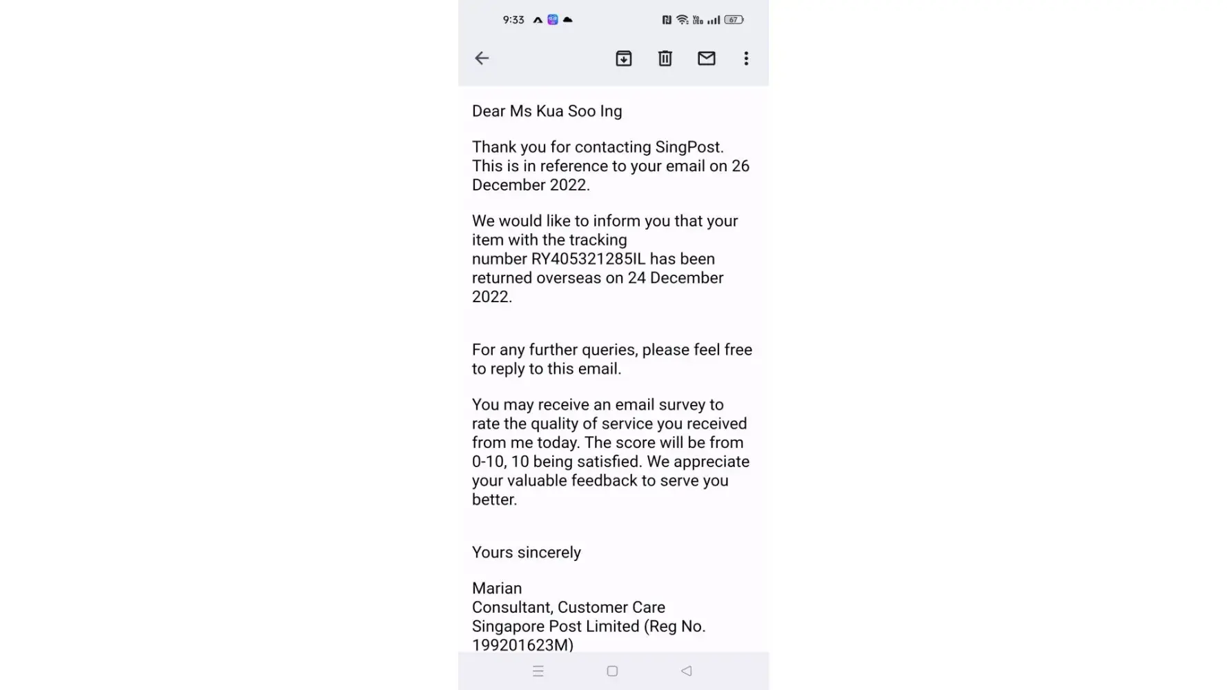 Can someone responsible from SingPost attend to my issue?