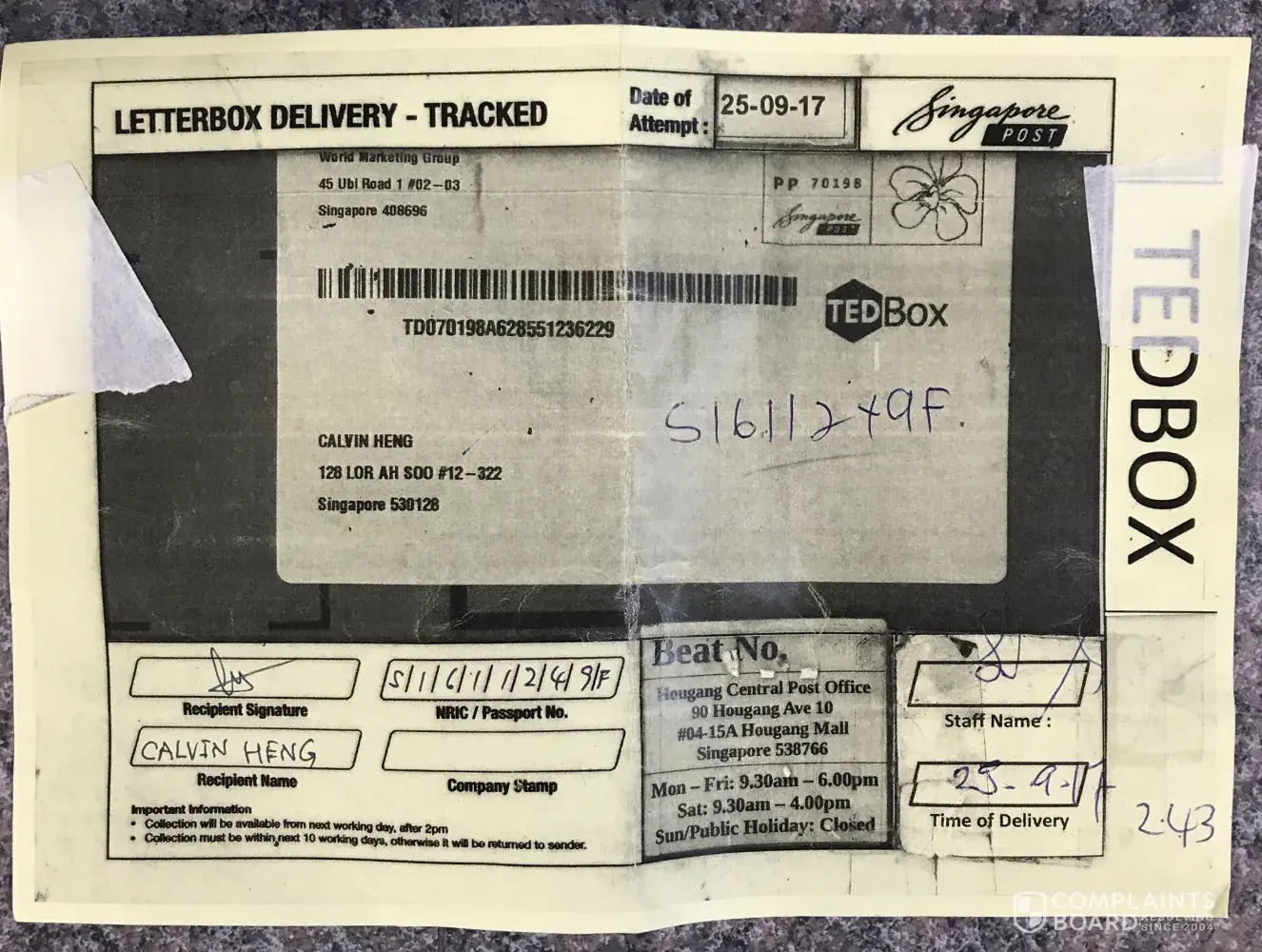 This delivery notice was issued to me as there was no one home to receive the parcel. The collection post office stated was Hougang Central Post Office. When I visited the Hougang Central Post Office on 26 Sep 2017, the person there told me the collection should be at Lim Ah Pin Post Office.