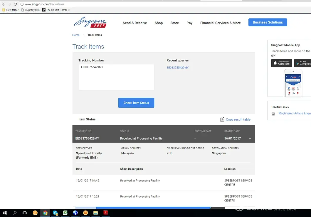 Returned from business trip and found card in letter box from Singpost. Tried to decipher instructions on the card - none of which actually refer to their mobile app or their Internet site - to track. In frustration, called them up. After reciting the item number several times (using the phonetic alphabet which still baffled them - Delta Echo being apparently incomprehensible!)