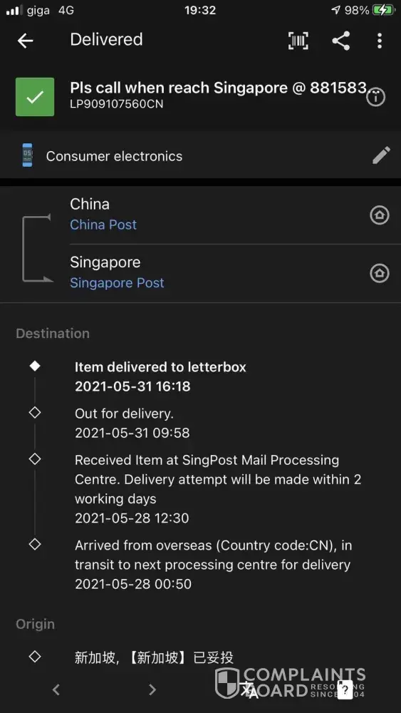My taobao parcel CNSGS0023882448 suppose to be deliver on 14 May, since my condo gate got problem need me to provide password to get through, usually courier will gave me a call but only singpost not doing that. They just send me a message notify that delivery is unsuccessful? Why don't give me a call in the first place? Then I call the hotline ask for re-delivery. Staff promise me to re-deliver on 15 May, I wait for whole day still never receive the item. Then I call in on 17 May again, hotline staff said still wait for updates and not sure when will be re-deliver. I paid the cost for air transport not sea shipping because I need the parcel urgently. I want to complain about this. Totally waste my time to call in and ask for the updates for so many times and in the first place, if condo gate cannot get through, courier suppose to give me a call!