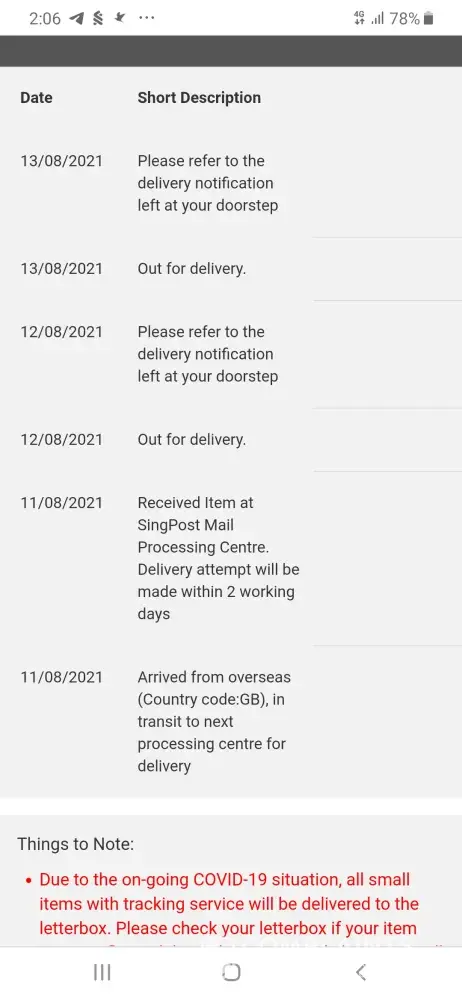 Firstly, there is no notification of when the parcel is arriving at my doorstep. The only information is "out for delivery" and I am supposed to wait for the parcel at home the whole day, no need to work. Other providers will give me an SMS, WhatsApp, telegram, Facebook message or email to inform me that my parcel is now at my doorstep and I can select to have the parcel left in the riser outside my flat, at my own risk. This is fine for me since I can get my relative to collect the parcel if I can't be home immediately. Singpost doesn't have this service and also does not allow change of delivery address.
