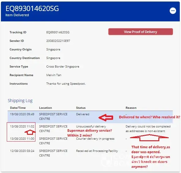 2nd delivery were made on 19th August 2020 at 949am according to the tracking system by speedpost. As usual, someone were at home at that point of time but no one in the family received anything or saw a postman/deliveryman came by. The tracking system on speedpost states "Delivered".