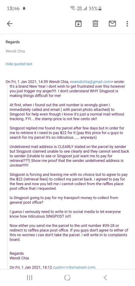 On 16 Dec @ 1149hrs, i wrote an email to Singpost to informrd them that my parcel address is wrongly given and also with the image of the parcel provided for them. I fully understand that this is just a normal mail postage and i won't be able to trace it. Hoping by providing the image and email to them i can retrieve my parcel.