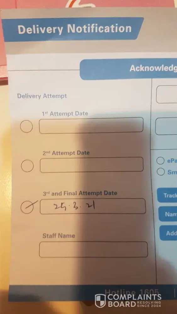 I was sound asleep at 8.20am on a Friday, 26th March 2020, when the bell rang for about 3 times. When i was awake and about to open my door, the postman lady left. When i checked my letterbox later in the day, there was a letter saying that it was already their 3rd and final attempt to deliver my stuff. The letter was addressed 25th March 2020 and not the 26th. The letter also states that if it is already the third attempt, my item will be sent back to the sender...