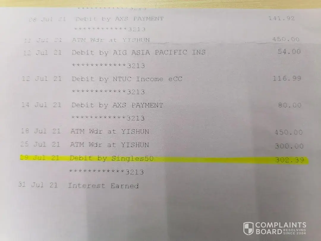 I realize that there was an unauthorized debit on 29th July 2021 of Three hundred two dollars and thirty-nine cents(S$302.39)of Singapore dollars to Singles50.