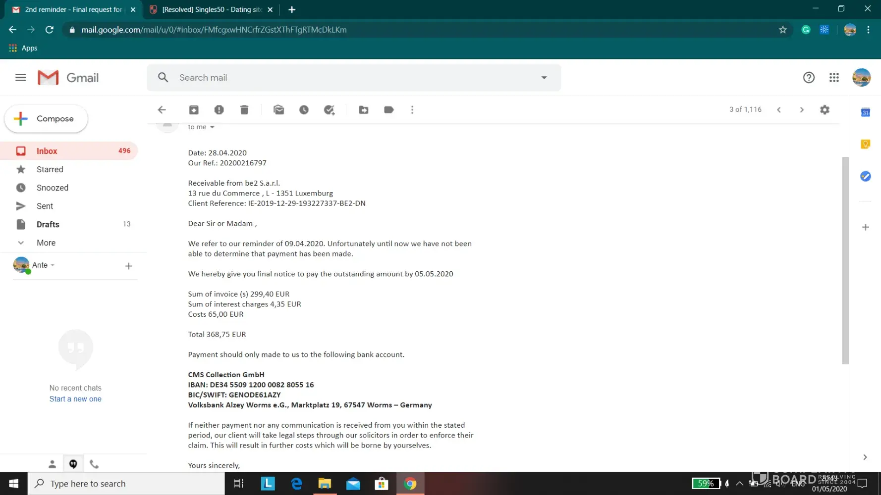 NEVER before this email, I didn't receive any warning or reminder from anyone.