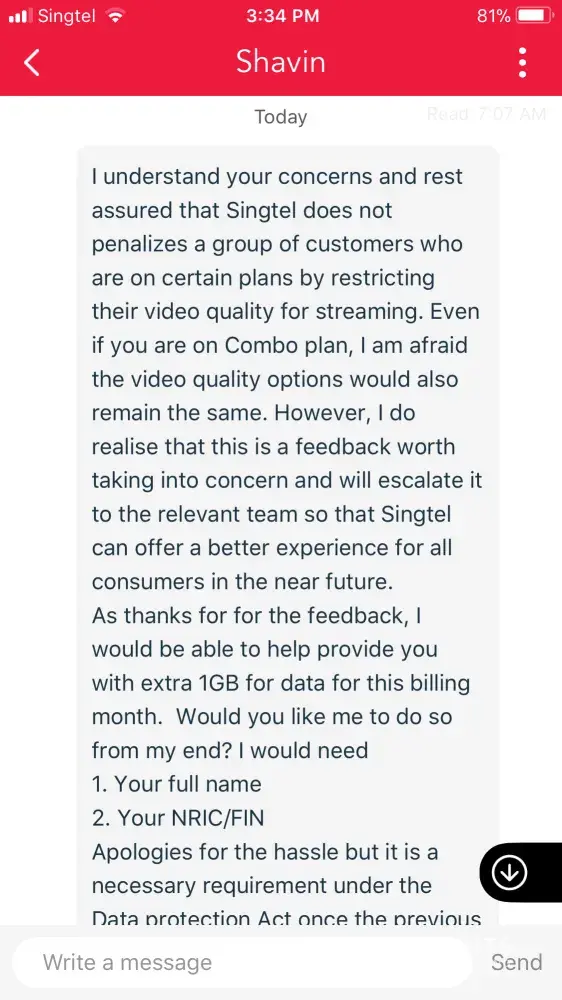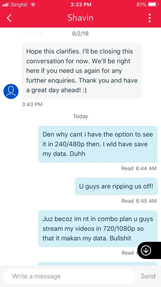 It's funny. I mentioned to a colleague at work yesterday that I was going to Singtel today to discuss this and he asked me why I belong to Singtel. He said their customer service is terrible. He is a customer of a competitor and told me they have great customer service. I assured him I didn't have any issues with Singtel. That is until today. I am canceling my service and going to a competitor. And, as is easily done today, I will be sharing my incident on social media so that quickly several hundred potential or existing Singtel customers see what they can expect from your company and its employees.