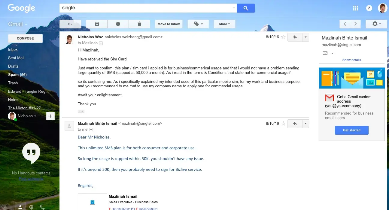After I touched down in Singapore, I rushed to SingTel retail shop at Ang Mo Kio Hub. After I reached there, I explained everything to the PIC and she told me that, "even if you queue for this issue, our shop unable to help and please call to 1688 to ask for help". They didn't even check it in detail and reject me directly with the reason above. Their attitude really make me upset. Therefore, I called to 1688 to ask about it. I was waiting for 20mins, finally I got through the call with the operator. I explained again my purchase problem, he taught and asked to reset password and all but in the end still failed. After almost 50mins, he asked me to try it again by myself due to he was holding my line too long and he will call me back after 20mins to check and confirm on my situation.