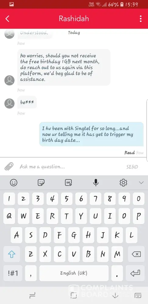 As last month December is my birthday, i should receive 1GB free data but i did not received it. The CS inform me that it yet to be trigger for month of Dec. I will receive the next cycle of the month. But this month i still did not receive. I was so upset as i have been with singtel for so long and there is no problem at all. Pls look into it .Thk