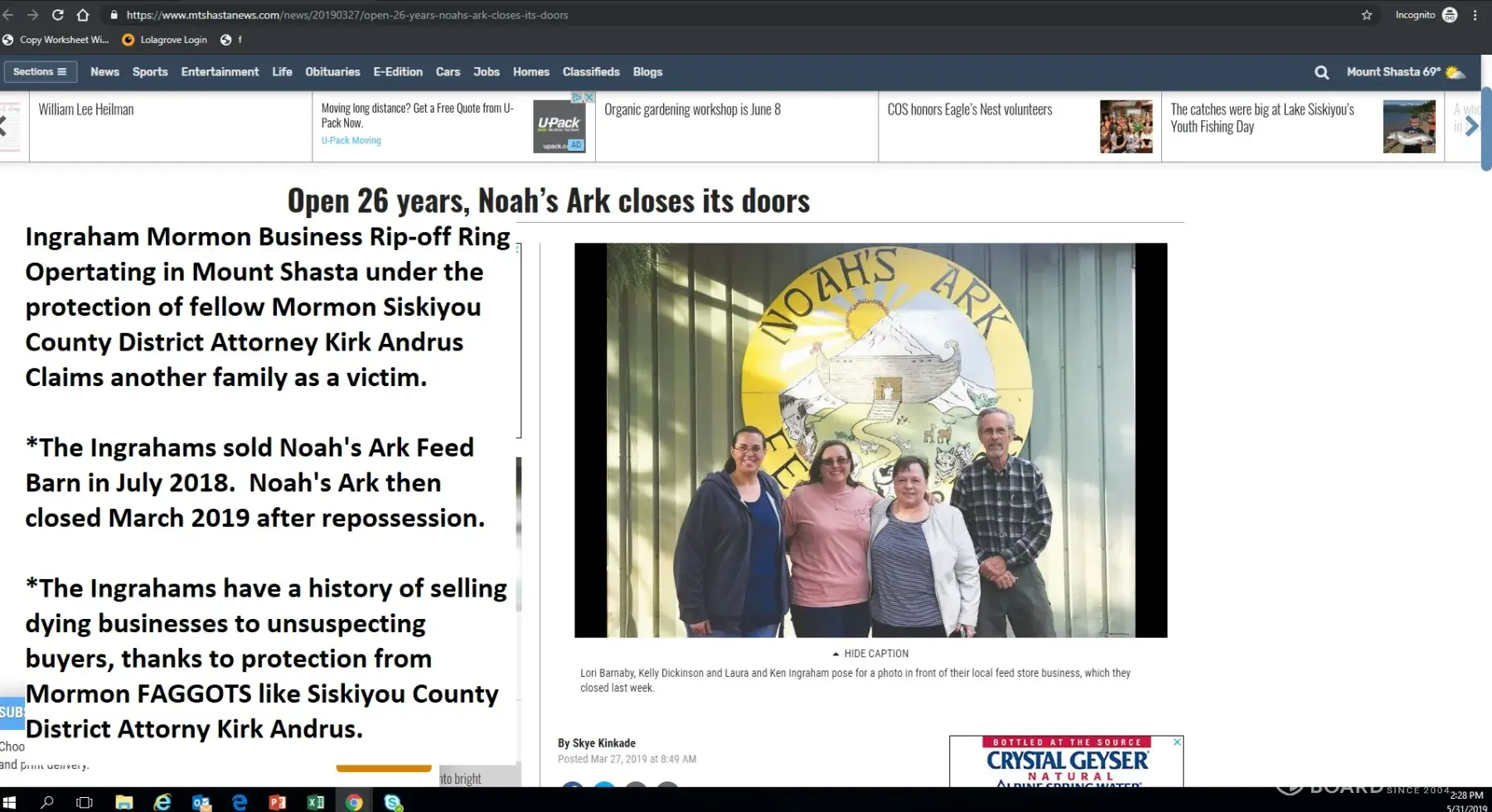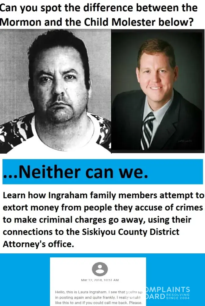 We've been trying to tell people for years that the Ingraham family are a bunch of scumbags who use their connections to Kirk Andrus and his daughters Abby Andrus, Kathryn Andrus, Emily Andrus to carry out business scams in the Mount Shasta area, and to use Siskiyou County Law Enforcement to extort victims for more money.