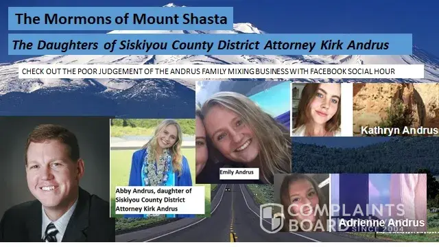 Sadly, Adrienne's father, Siskiyou County District Fool Kirk Andrus was asleep at the switch and publicly mocked us when we tried to warn him about the existence of a Mormon Rip-off ring operating in Mount Shasta. This is no surprise, because the Mormon Rip Off Ring members are friends of the Andrus family.