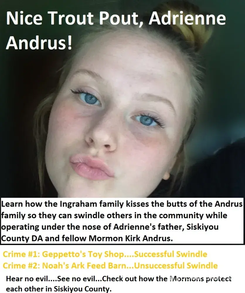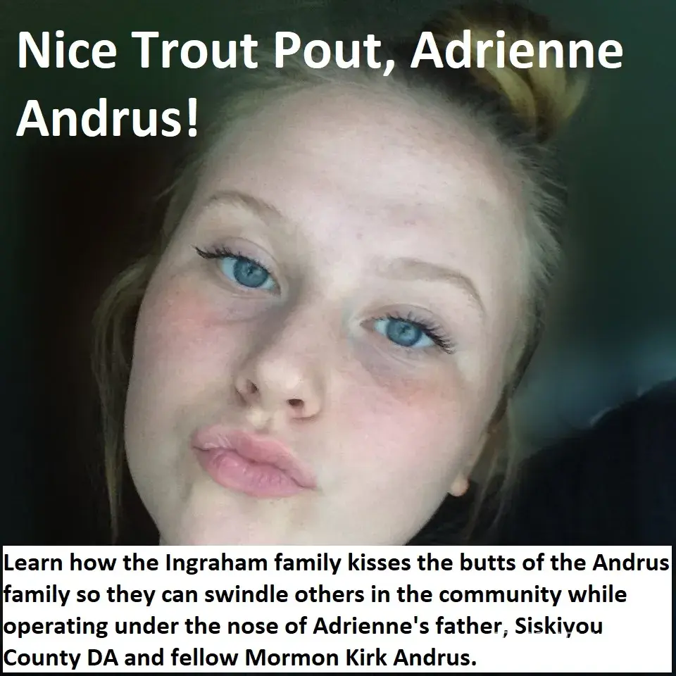 Learn how the Ingraham family kisses the butts of the Adrienne Andrus and her family so they can swindle others in the community while operating under the nose of Siskiyou County District Attorney Kirk Andrus.