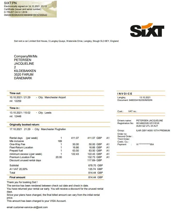 From 16 Dec 2021 through 15 Jan 2022 I rented a vehicle from Sixt in Ostersund/Sweden. My customer number was 9815536, reservation No [protected], Registration UHZ 17X, Internal No [protected].