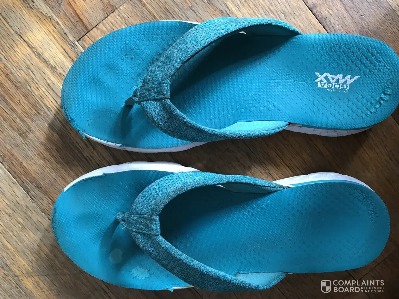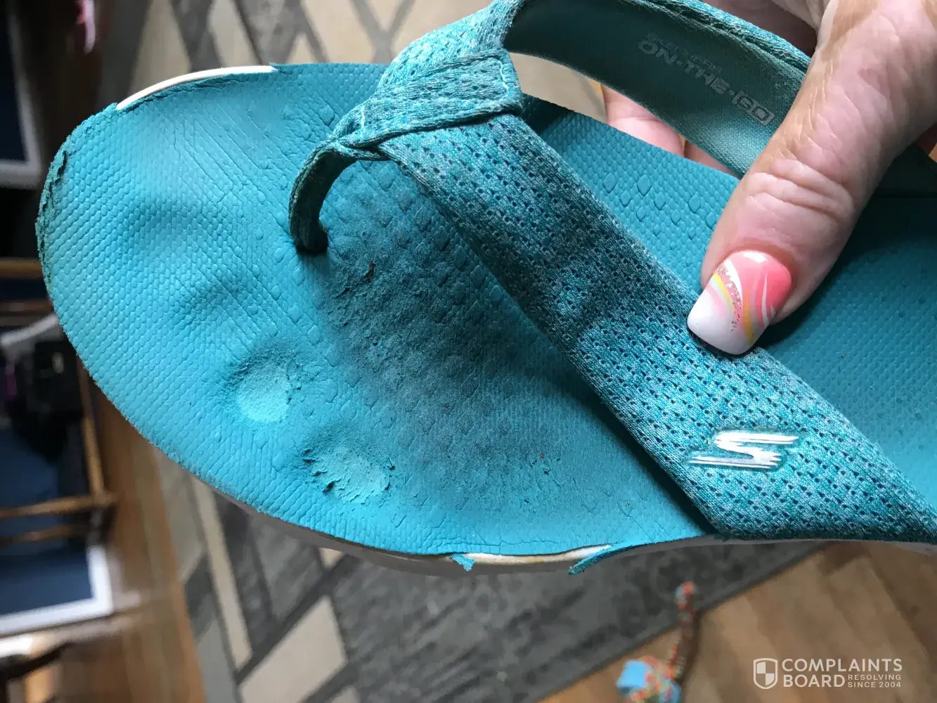 I bought these flip flops in April 2017 at a Skechers store in Bridgewater Commons Mall. I did not start wearing them until the weather got warmer late May. I am truly disappointed in how they are wearing and how they look. I have only worn them in good weather. When I went to the store to complain the only sales person did not even make a suggestion. Her response was " probably bare feet does that" Aren't flip flops meant to be worn with bare feet? I am extremely disappointed as sketchers are supposed to be a quality shoe.