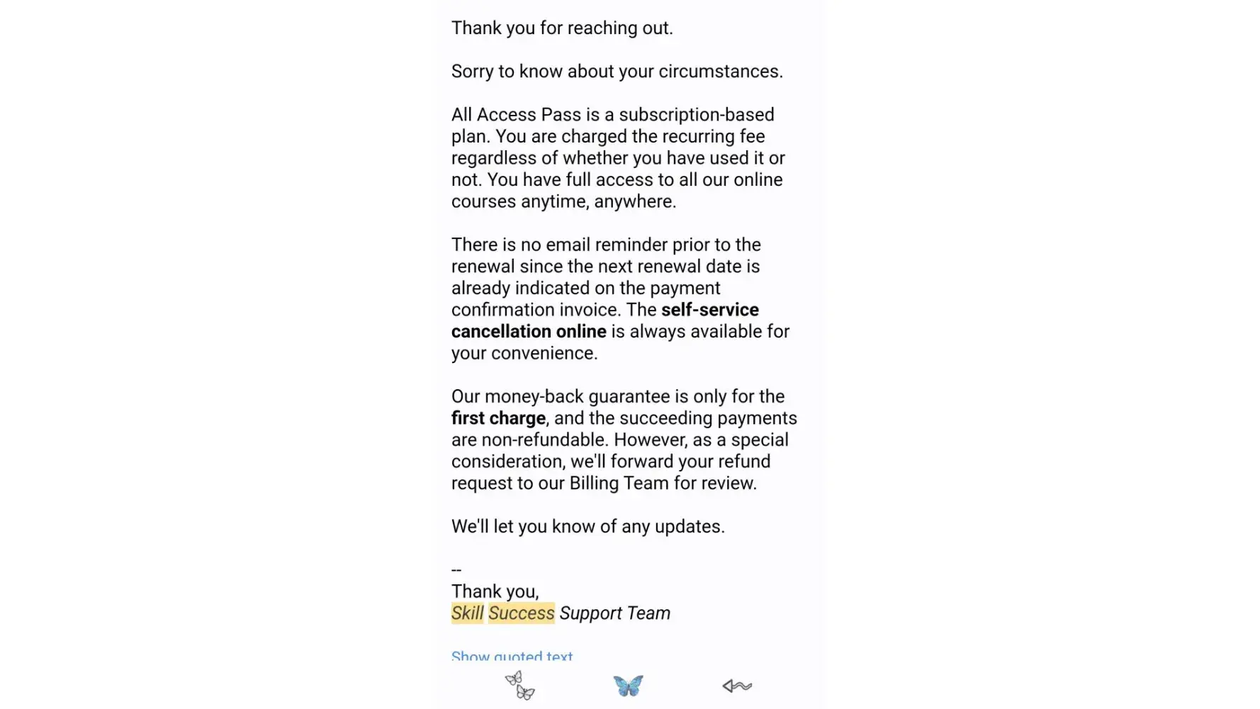 We signed up for Skill Success but found it wasn't right for us so we cancelled on the last day of our trial period. While we notified them to cancel the subscription with the trial period, they didn't process it that day so they say we still own the $230 fee. We had to arbitrate this through our credit card company but luckily our email shows a clear effort on our part to cancel the service within the trial period and before we should have been charged for the service. This company preys on people. Stay away!