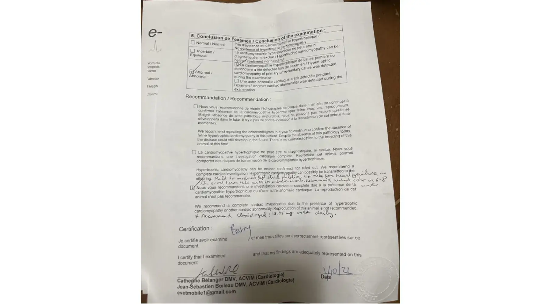 At a year we checked his heart via scan and found he was equivocal. We followed up that scan with a board certified cardiologist. She wanted another scan done so we rescanned a third time at the 6 month mark and he now has HCM.