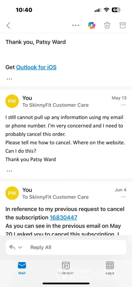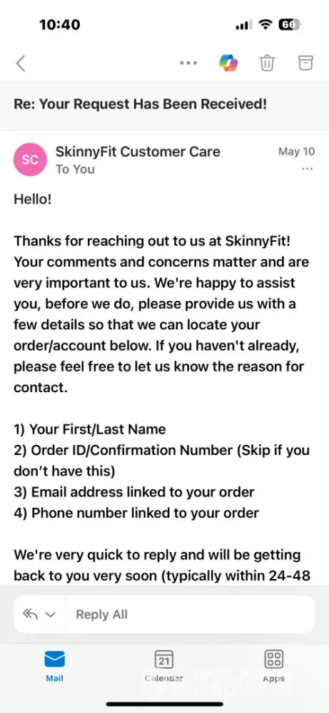 I placed a trial order on 05/09/25. It took forever for the product to deliver, yet you are allowed 21 days from order date to review; therefore, not much time to tell if beneficial or not. Per medical advice, I initiated a return on 05/23/25 requesting a return label. SkinnyFit states that a return initiated with 21 days from order date will not be...