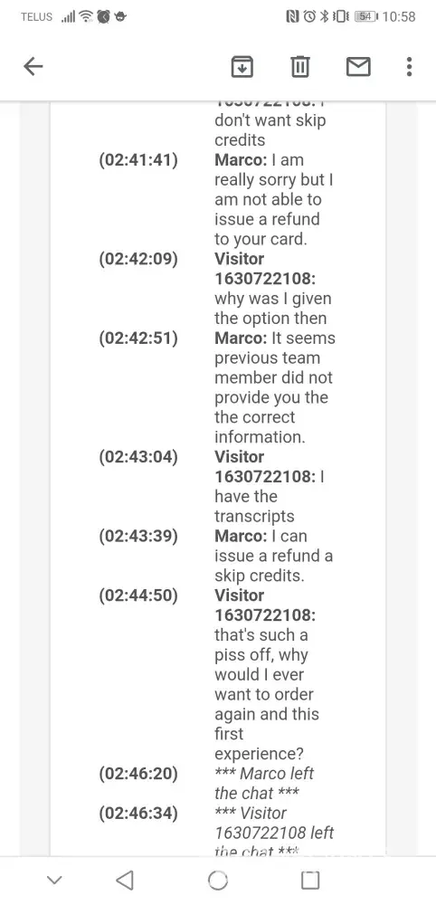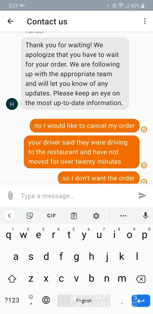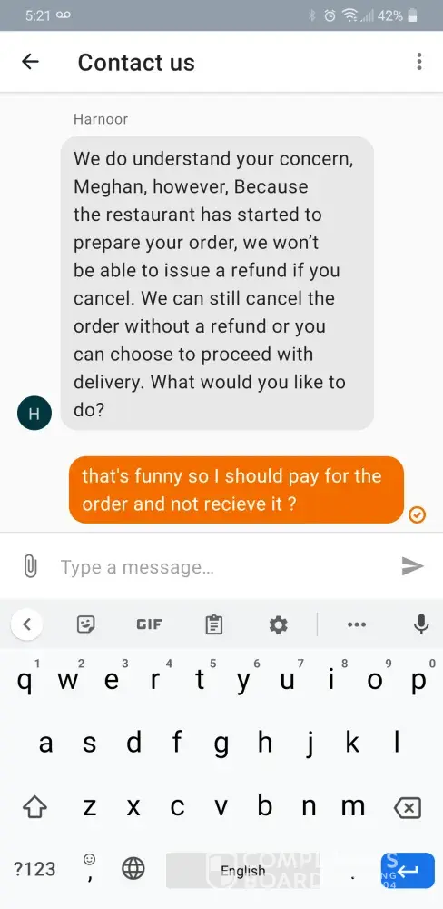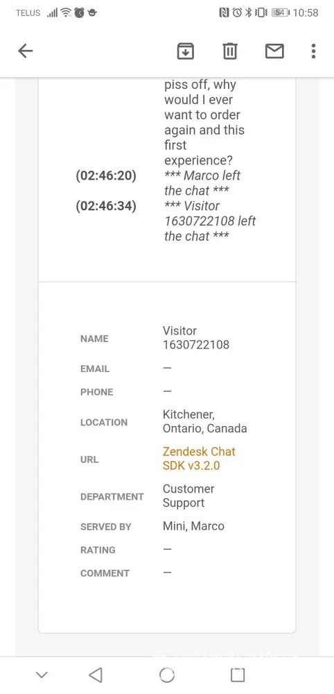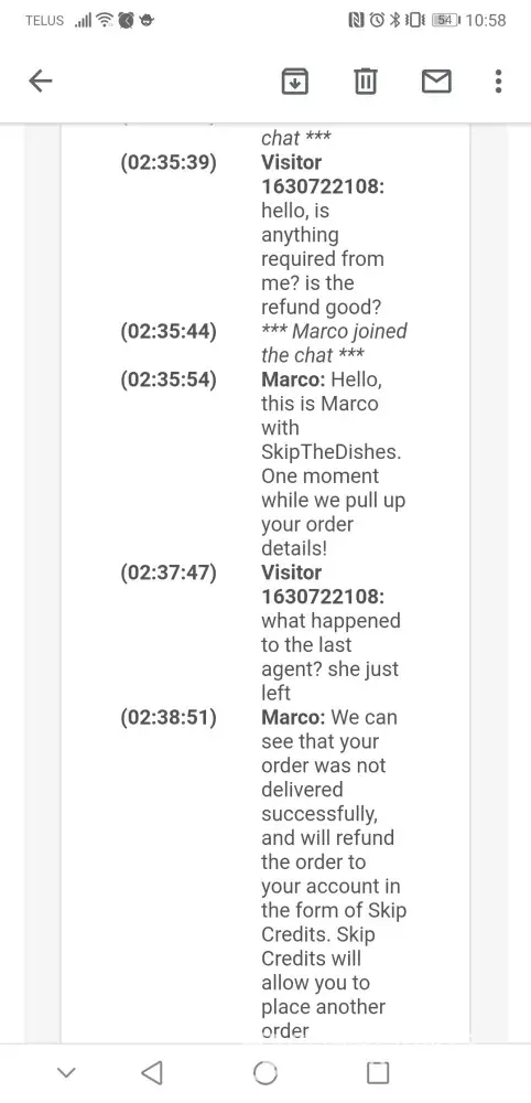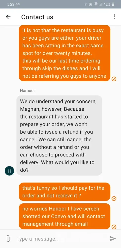 I am contacting you regarding the horrible customer service that we recieved today. I am a gold status member of skip the dishes but will not ever be ordering from you guys again. Your courrier accepted my trip and was supposed to be driving to the restaurant. Instead of going to the restaurant they sat in the same place for over twenty minutes. When I contacted support I was told "you can cancel and have no refund" the support team was very rude and unhelpful. I will tell everyone I know to never deal with skip the dishes after today. You lost a very faithful customer and gold status member. Hanoor was the name of the customer service person and the reason that we will never be back. I've added a snap shot of our convo