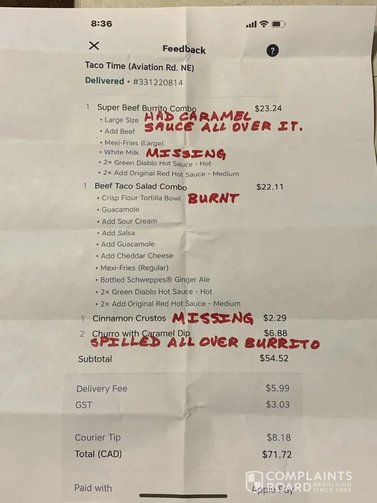 Caramel sauce all over burrito, missing milk, missing crustos, taco salad bowl was burnt, no caramel sauce left for churros. This was the worst meal ever. It all went into the compost - at least the items we did receive. Quite upset about this waste of $71.72. I AM NOT SURE IF I WILL EVER TRUST SKIP THE DISHES AGAIN. IMPOSSIBLE TO CONTACT WHEN THERE IS A REALLY BAD PROBLEM.