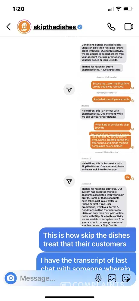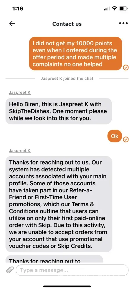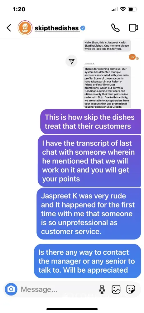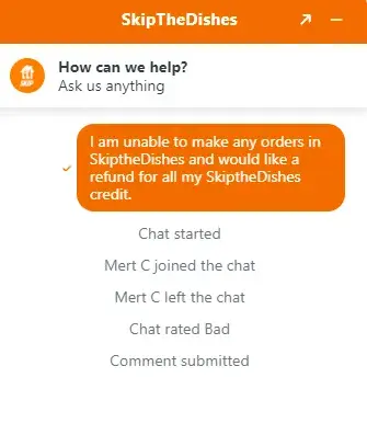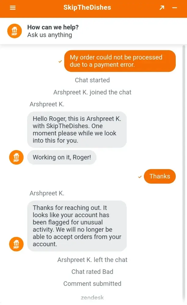 I was later told by support staff through chat that my account was flagged for suspicious activity and because of that I am unable to place any orders. Since then, I've been trying to get through Support staff on the SkiptheDishes website repeatedly but they leave as soon as I ask for my problems to be solved! Sometimes, without even saying anything!