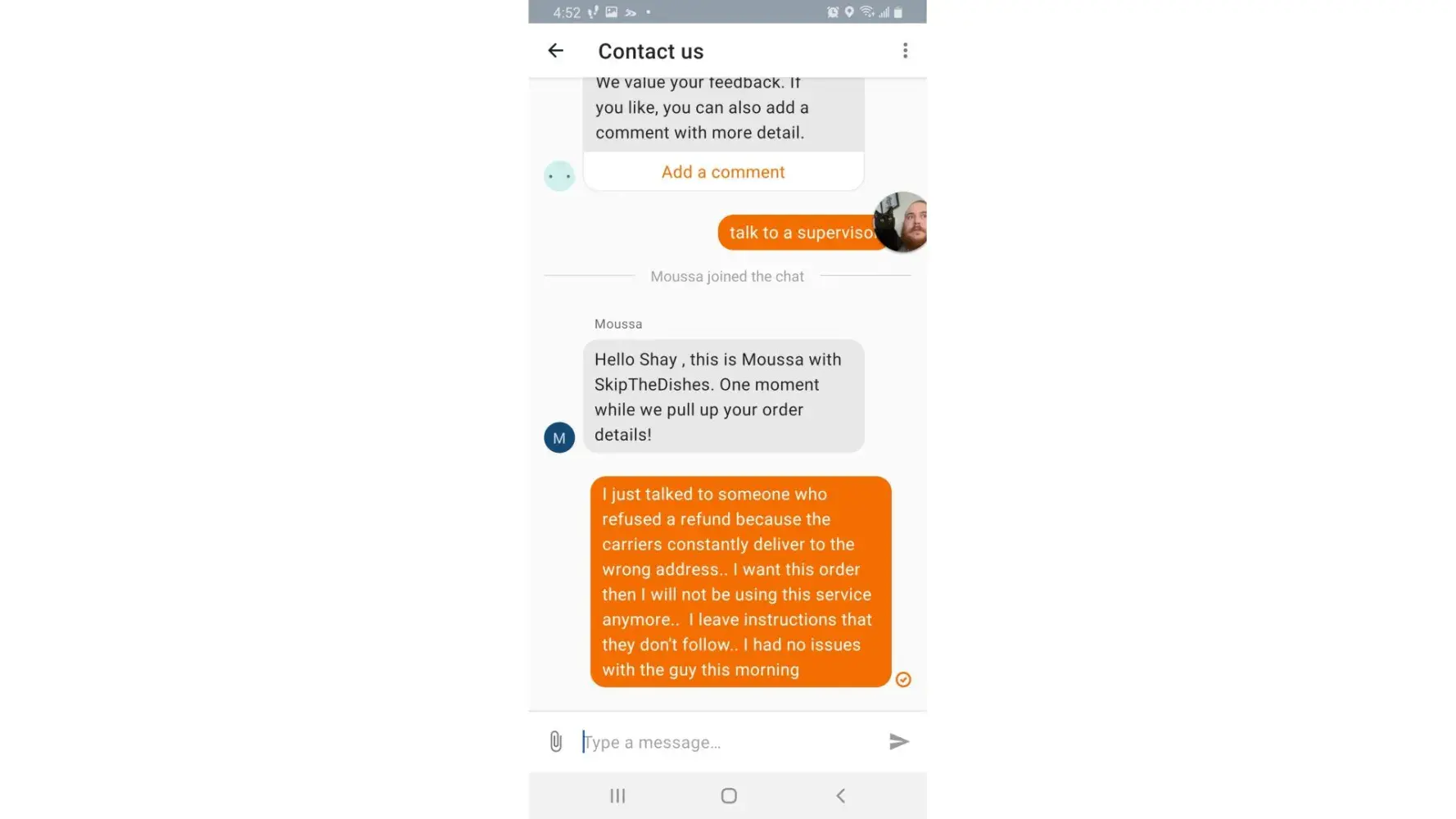 I am complaining about the skip the dishes agent.