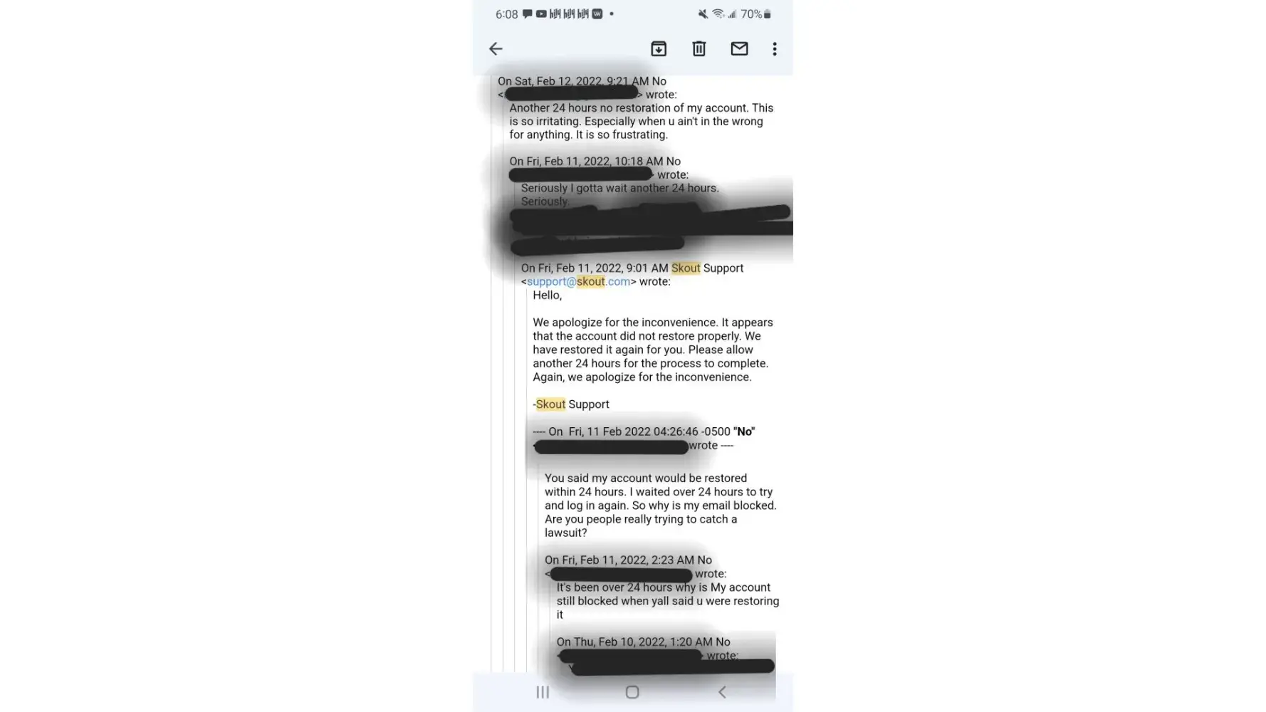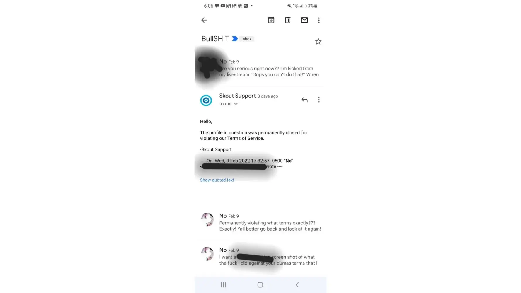 I was on Skout one day watching my friend stream. We were all chatting and suddenly, I was kicked from the live. I tried to rejoin, but it showed "We're cleaning up the LIVE theatre right now" so I gave up and decided to go back later. I went back later, and my account was closed. I tried to log back in, and my account was blocked. I have messaged Skout support repeatedly and each time I ask what terms I violated they ignore me! And I know for a fact I did not violate any terms of service! I don't post anything promiscuous, and I don't show anything inappropriate when i'm on stream. I didn't say anything inappropriate to warrant a ban. I am beyond angry, because I have put money into my account, and I use it on my friends! I can't even get a refund for all the money i've put into it! 92nd
