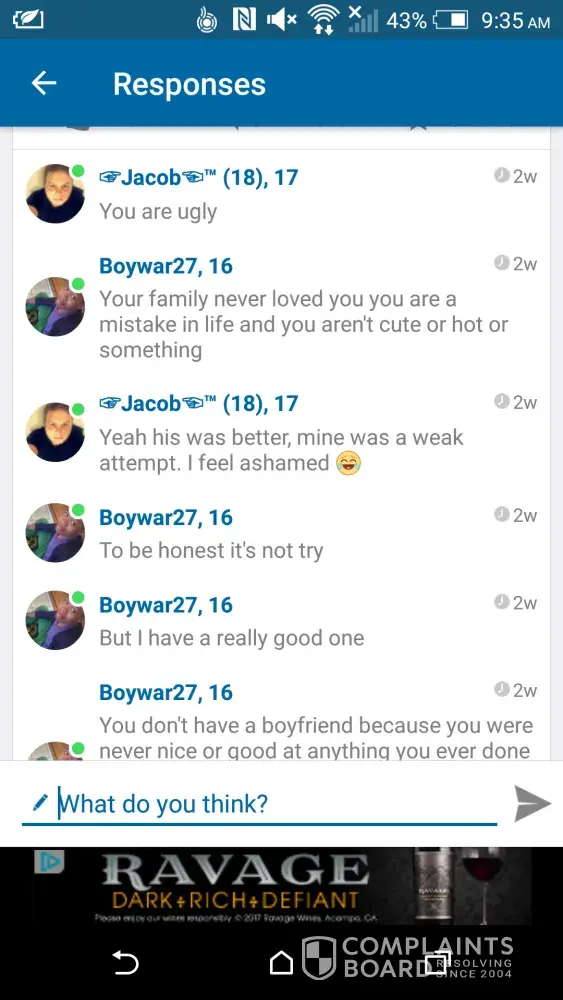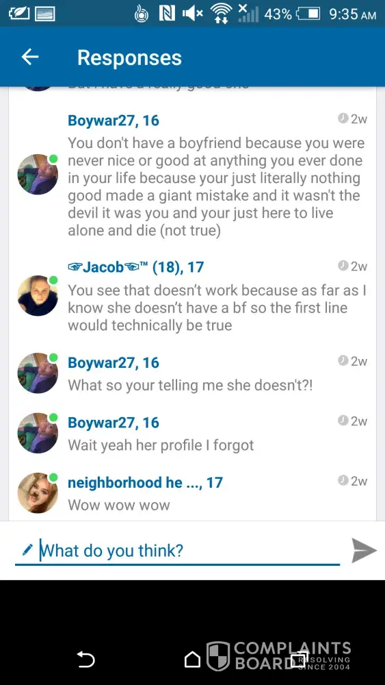 One day on Skout a few weeks ago, someone made a post and I commented on it (not really saying anything bad, I was just stating my opinion) and these two users (Jacob and Boywar27) starting attacking me out of the blue saying that I was ugly, and that I will die alone and that I don't have a boyfriend because I can't do anything right, etc. I screenshotted and posted two pictures of their comments down below.