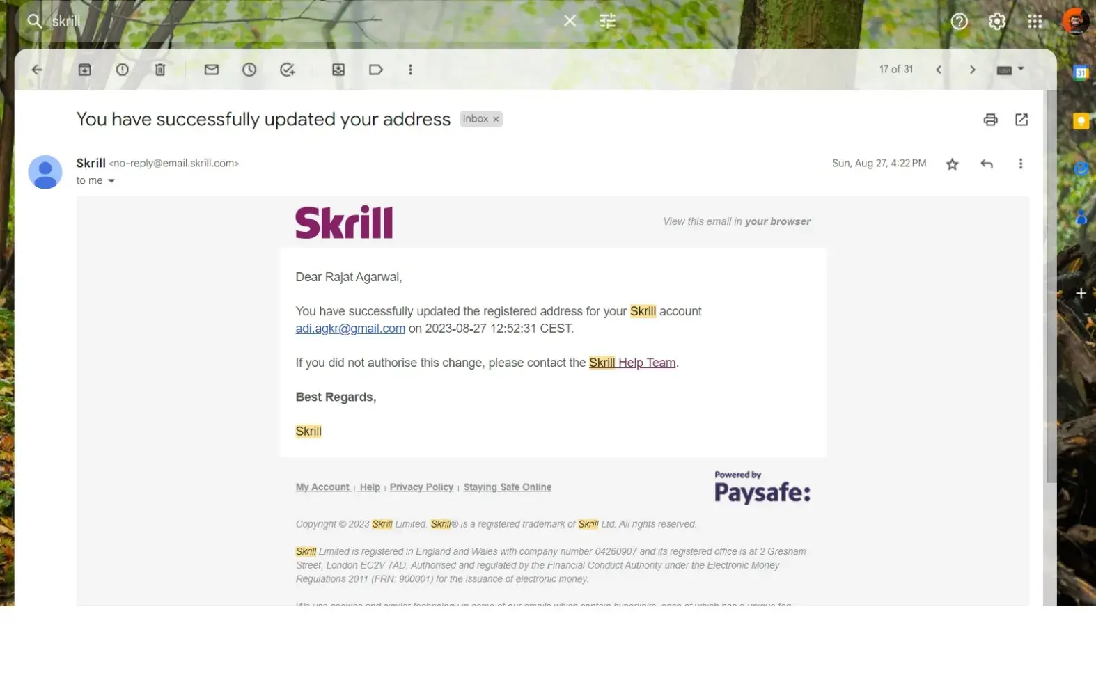 On Tuesday night I found an email from Skrill :